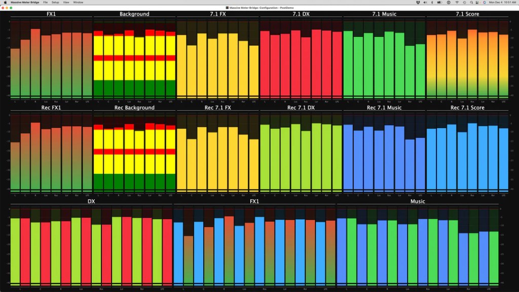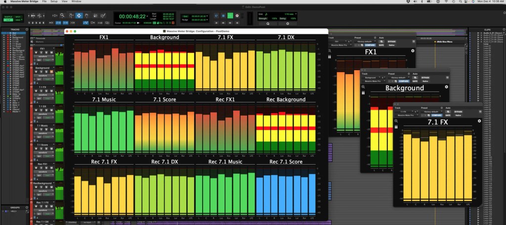 Meter Bridge ProとMini Meterプラグイン、Massive Meterプラグイン、Massive Meter Proプラグインを組み合わせることで、複数のMeter Bridge Proアプリケーションをそれぞれカスタマイズされたビューで設定し、各アプリケーションがPro Toolsシステム、VST3プラグイン形式をサポートする任意のDAW、または任意のCoreAudioデバイスからMassive Meterを表示するシステムを構築できる点にあります。これにより、大規模なポストプロダクションスタジオでは、各ミキシングエンジニアごとにカスタマイズされたメーター表示、または各ミキシングエンジニアごとに複数の表示を設定することが可能です。